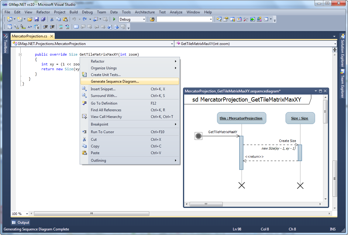 Here’s another context menu item that you can get by right-clicking on a method. You can reverse engineer your code to get an automatically generated sequence diagram.